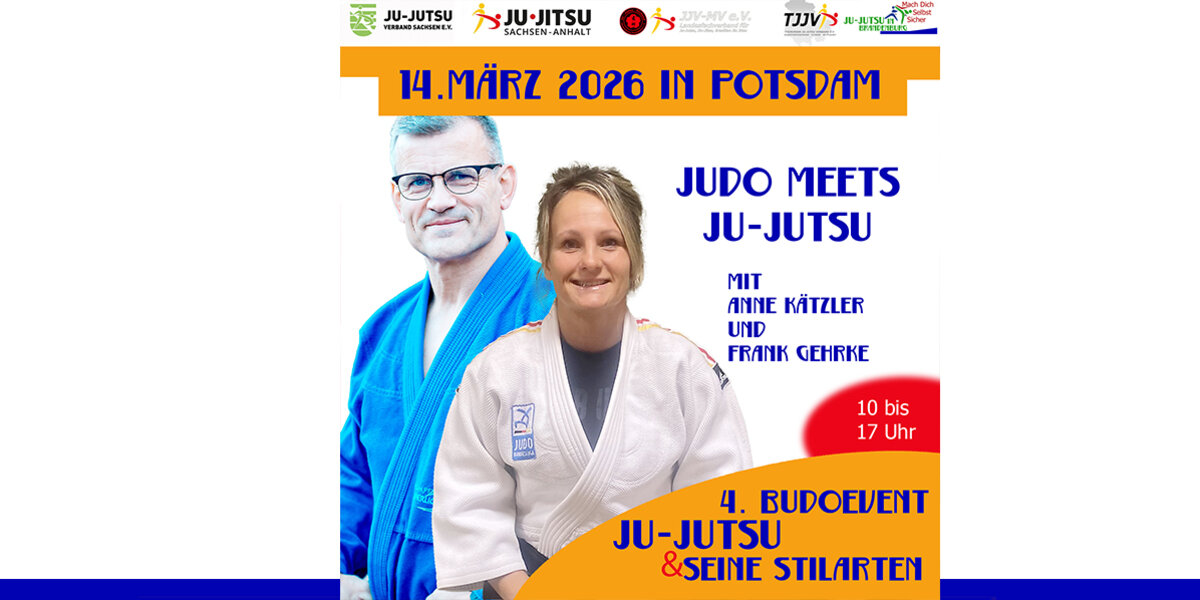 Heute haben wir das erste Mega-Event des Jahres für euch: das 4. Budo-Event Ju-Jutsu und seine Stilarten - mit insgesamt 11 Referenten für die Landesverbände Brandenburg, Mecklenburg-Vorpommern, Sachsen, Sachsen-Anhalt und Thüringen. Und diese Experten wollen wir euch natürlich vorstellen. Heute: Frank Gehrke und Anne Kätzler. Unter dem Motto "Judo meets Ju-Jutsu" zeigen die beiden euch in vier Einheiten zum Beispiel Würfe und Übergänge in den Bodenkampf.