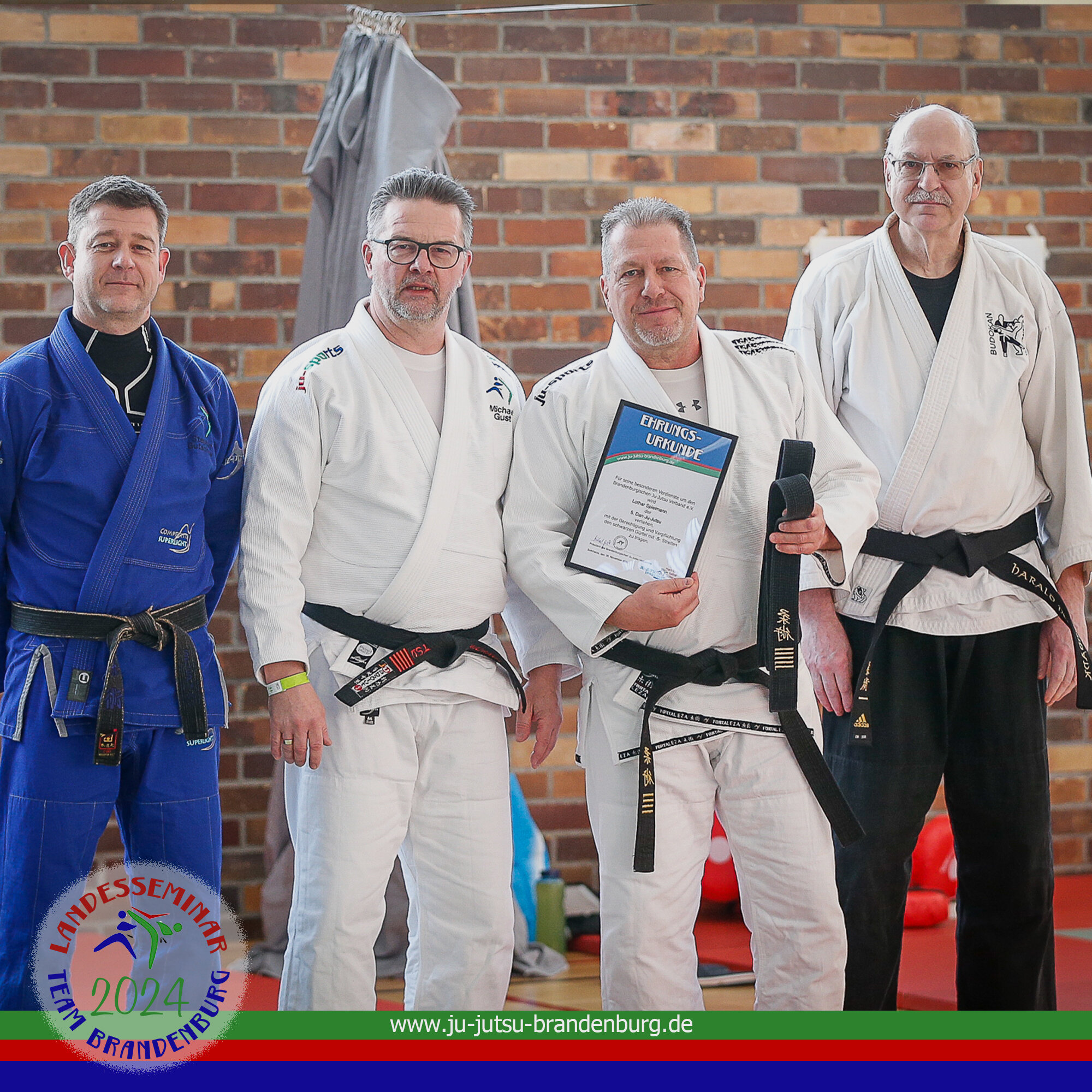 Beim Brandenburger Landesseminar war er natürlich als Referent auf der Matte. Doch heute waren aus einem anderen Grund alle Augen auf Lothar Spielmann, Vizepräsident Breitensport und Referent Prüfung beim BJJV, gerichtet. Denn er wurde geehrt. In hunderten Stunden ehrenamtlicher Tätigkeit hat er maßgeblich am neuen Prüfungsprogramm Ju-Jutsu gearbeitet. Für seine besonderen Verdienst wurde ihm der 5. Dan Ju-Jutsu verliehen. Wir gratulieren von Herzen – und feiern dich!