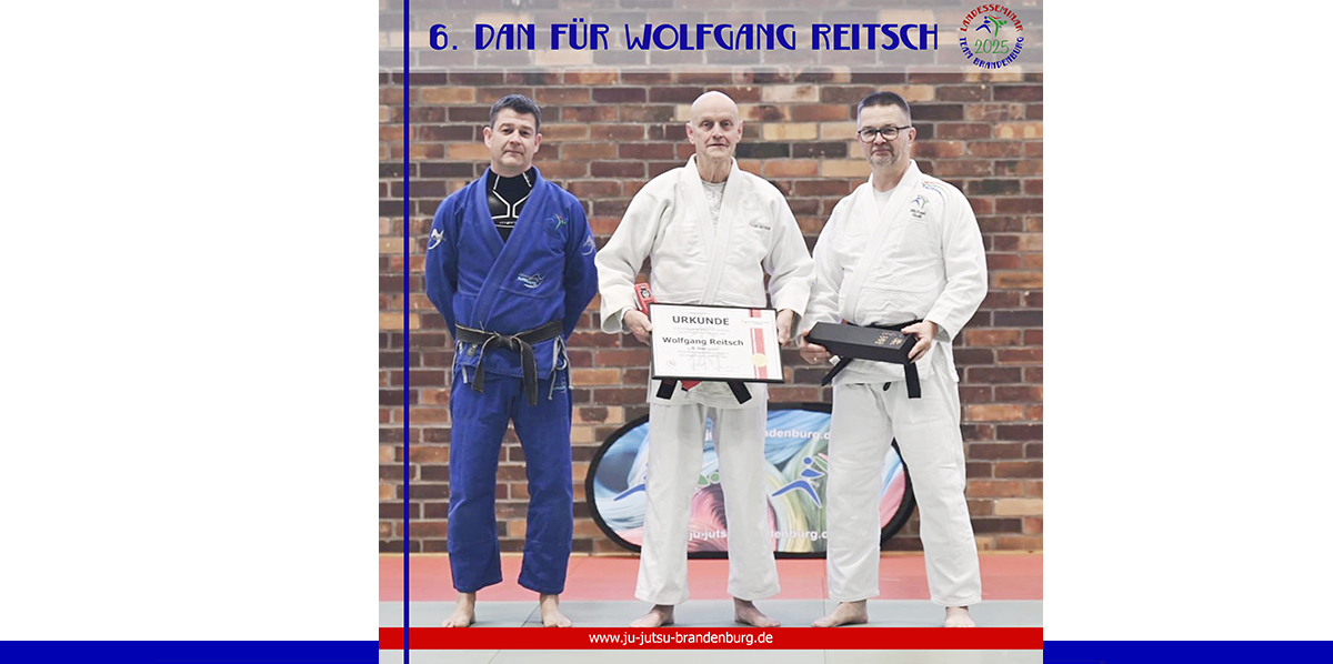 Für diese Lebensleistung ehren wir unseren Ehrenpräsidenten Wolfgang Reitsch, nach vielen Auszeichnungen auf Landes- und Bundesebene mit dem 6. Dan Ju-Jutsu. ![]()