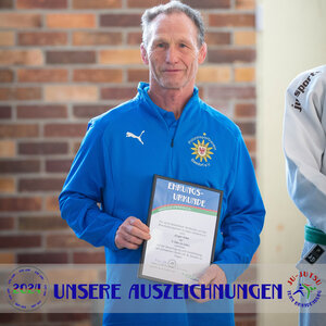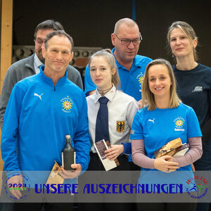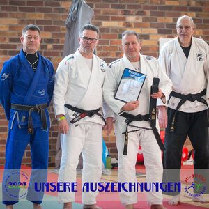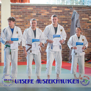 Weiter geht es mit unserem Rückblick auf 2024. Heute wollen wir unsere "ausgezeichneten" Ju-Jutsukas feiern. Und die Liste ist lang, sehr lang. So wurde zum Beispiel unsere Weltmeisterin Alexa Frei Sportlerin des Jahres im Landkreis Barnim. Unser Präsident Michael Gust wurde mit einer der höchsten Auszeichnungen des Landessportbundes Brandenburg, der Ehrennadel in Gold, ausgezeichnet. Und unser Vizepräsident Breitensport wurde der 5. Dan verliehen. Und er wurde vom DJJV für seine Arbeit zum neuen Prüfungsprogramm Ju-Jutsu mit der silbernen Ehrennadel geehrt.
